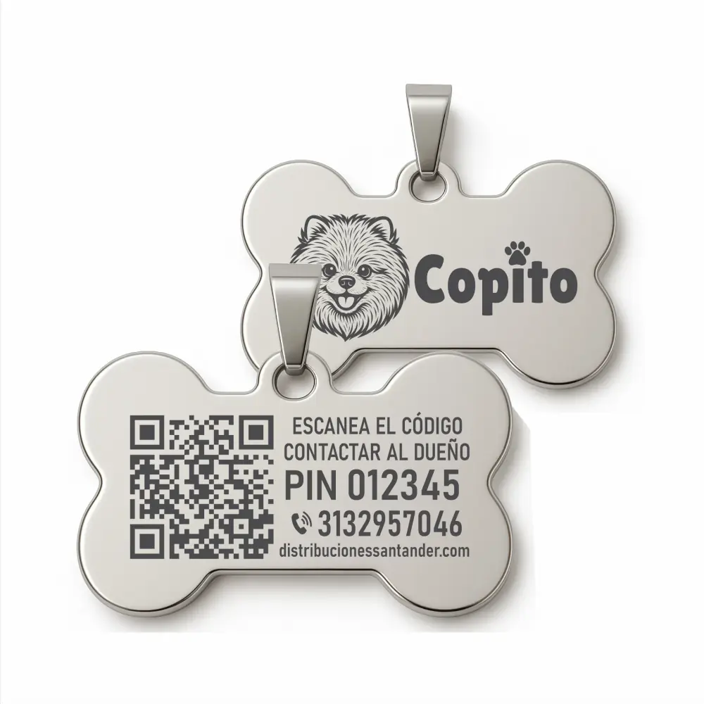 Placas identificación acero inoxidable anti-pérdida mascotas. Puedes comprar acá en Distribuciones Santander