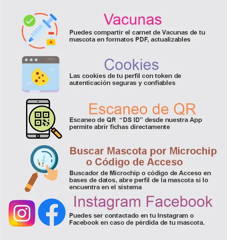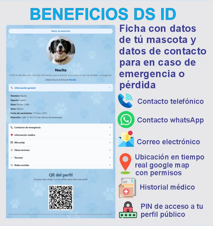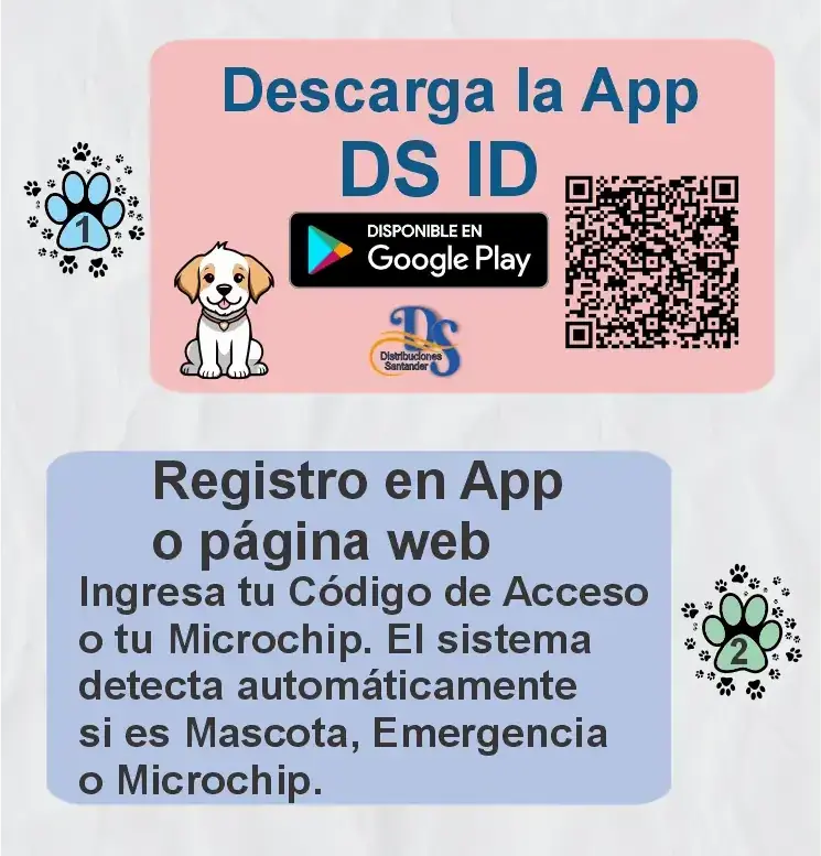 ✅ QR inteligente: conecta a un perfil digital (DS ID) con la información de tu mascota.