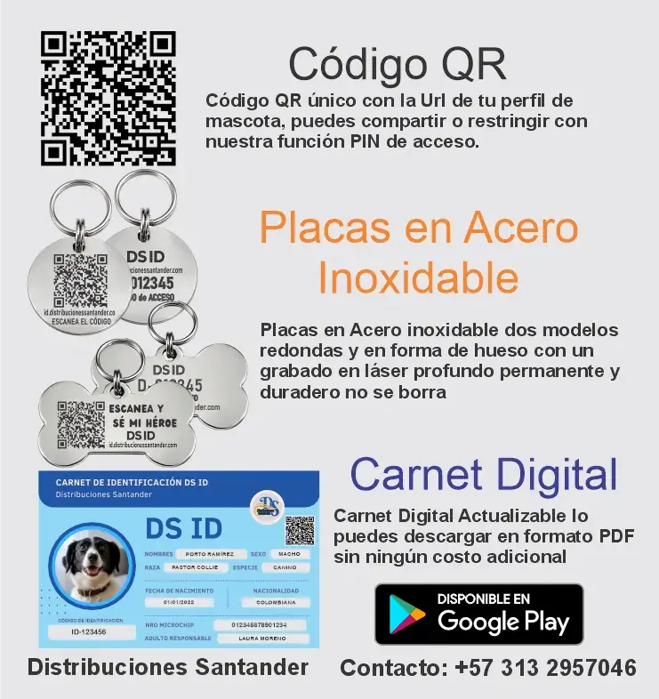 📌 Compra tu placa inteligente con QR en Distribuciones Santander y protege a tu peludito con identificación moderna y segura.